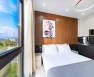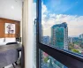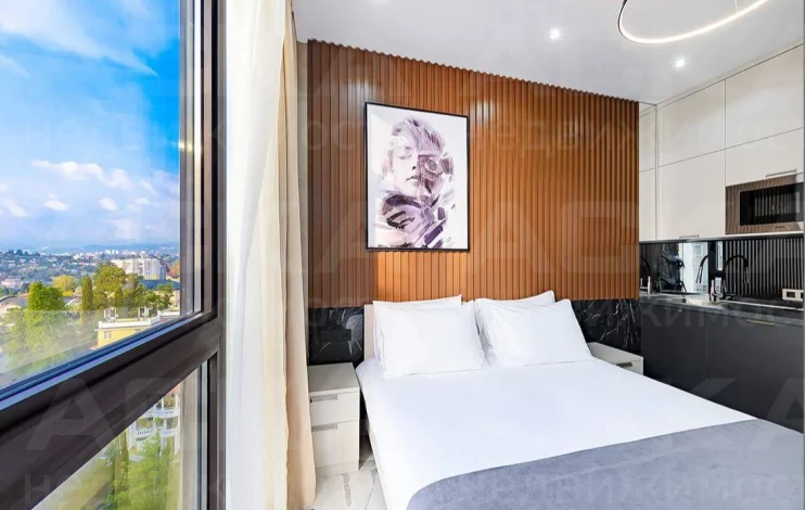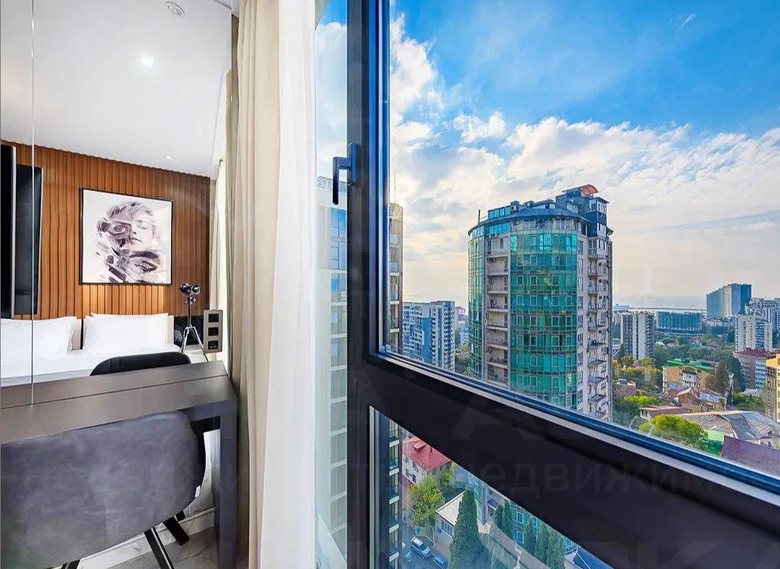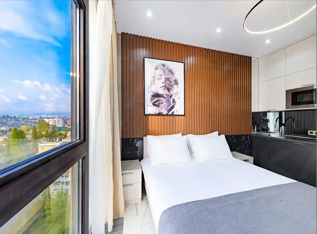 Студия располагается на 16 этаже, благодаря чему из панорамного окна открывается потрясающий вид на город.