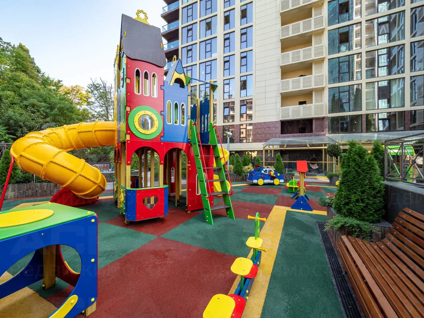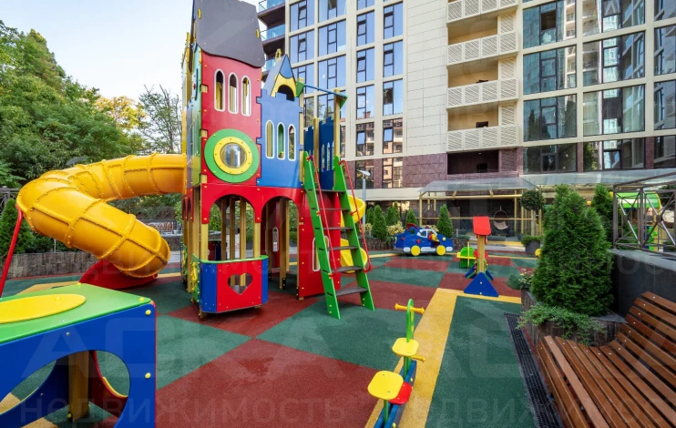 Во дворе комплекса достаточно пространства с качелями и горками для прогулок с детьми. Разработанный ландшафтный дизайн не оставит равнодушным даже скептически настроенного покупателя.