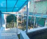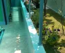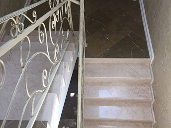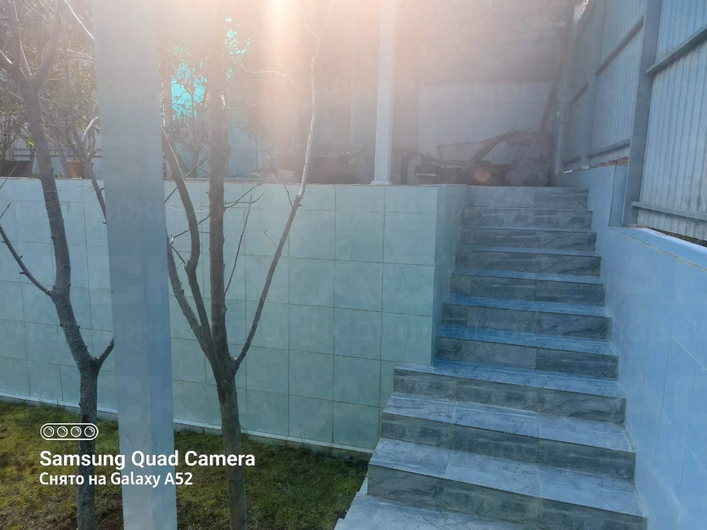 Территория вокруг дома и в саду выложена плиткой, три уровня участка отделены железобетонным ограждением с отделкой плиткой, фундамент дома и забора также обложены плиткой. Вокруг дома и входа на участок навесы из поликарбоната.