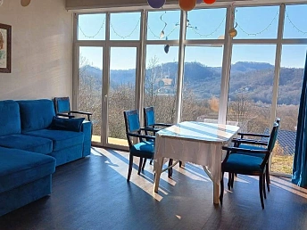 На первом этаже: зал, совмещённый с кухней, жилая комната с мебелью, санузел с большой душевой кабиной и теплая веранда с тёплым полом от газового отопления.