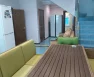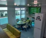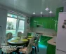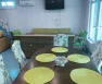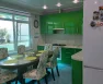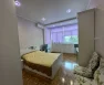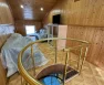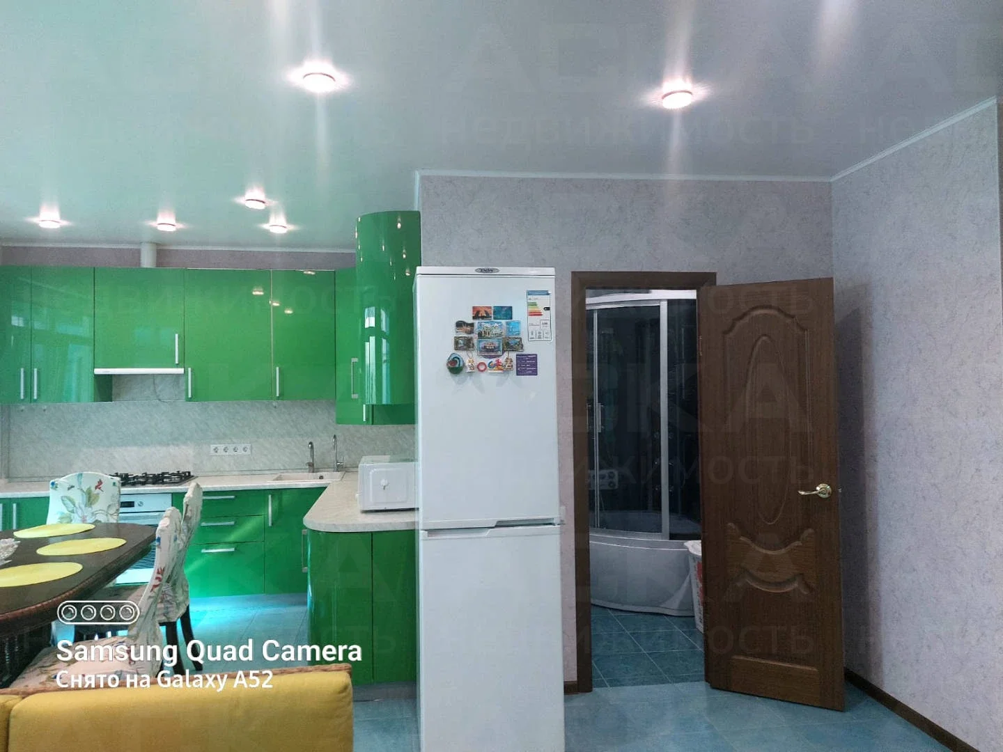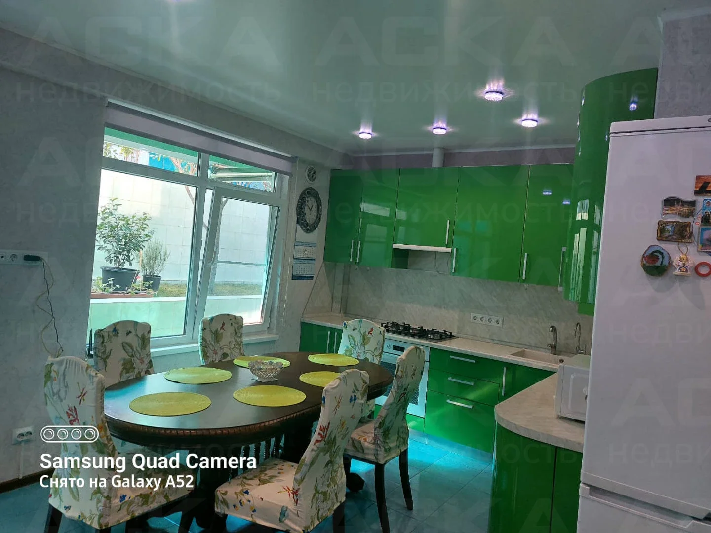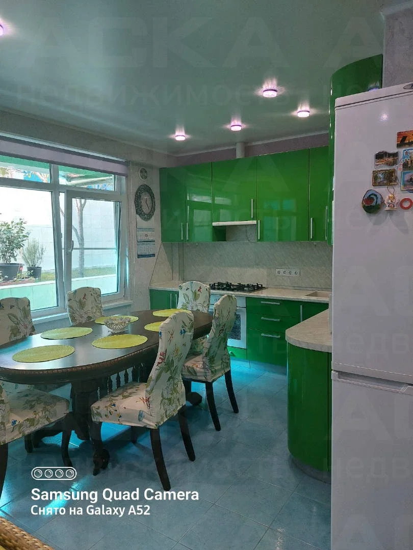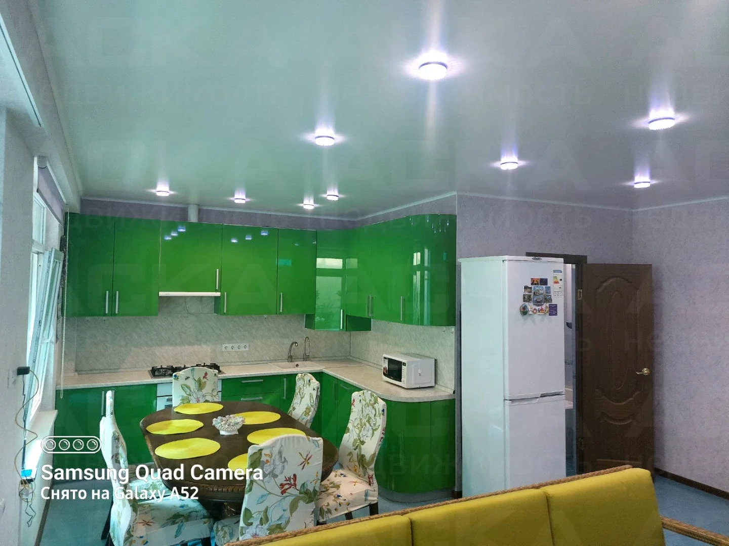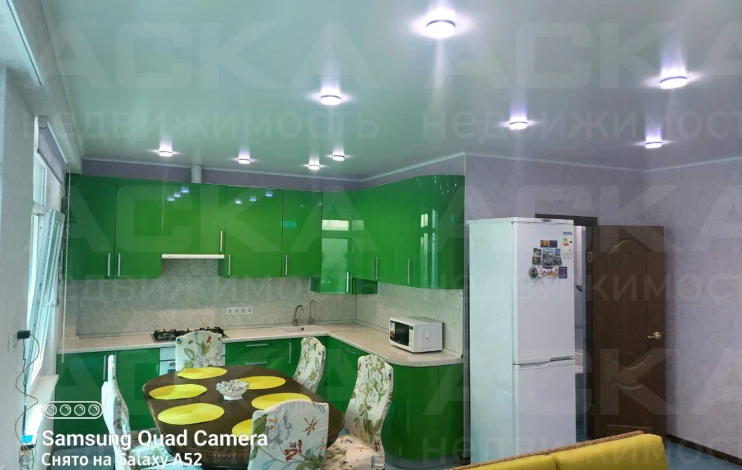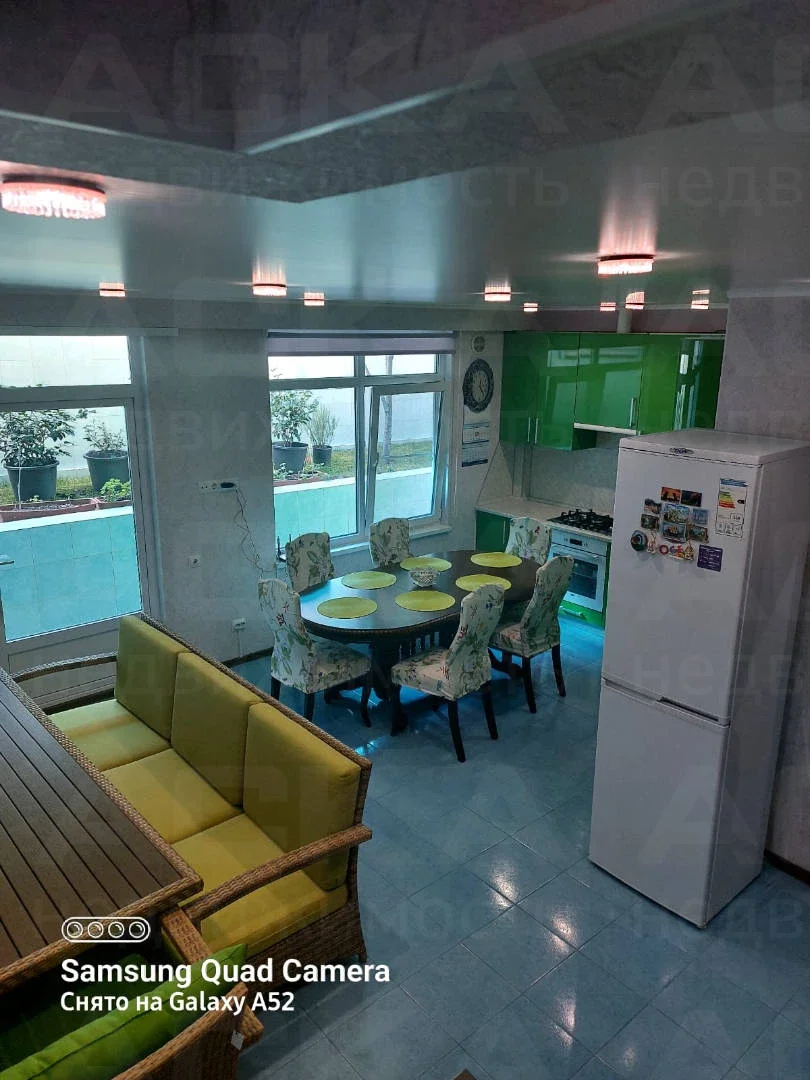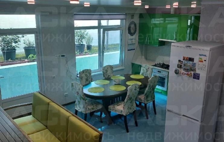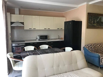 На кухне: кухонный гарнитур, газовая плита с духовым шкафом, посудомоечная машина, два холодильника, обеденный стол и стулья. В зале: диван, итальянский обеденный гарнитур, два кресла и два дивана. Освещённость обеспечивают множество световых точек.