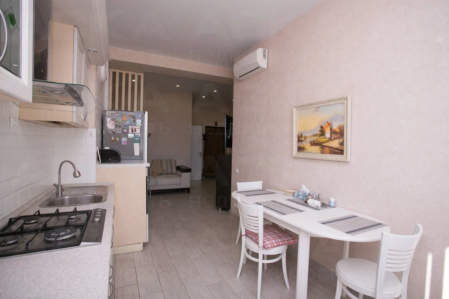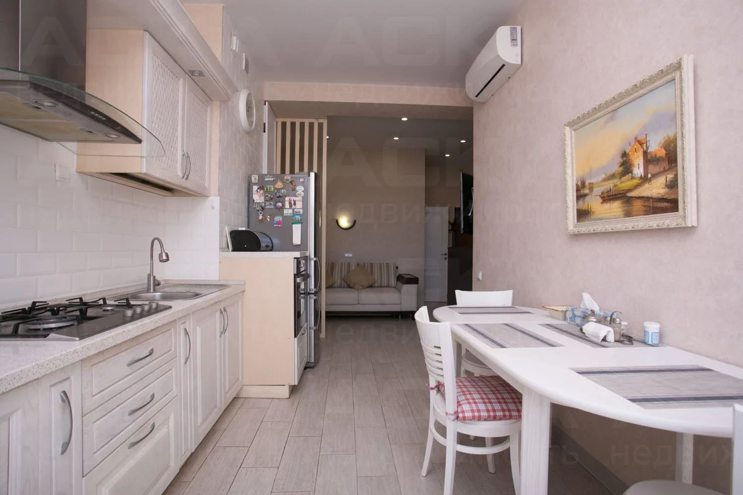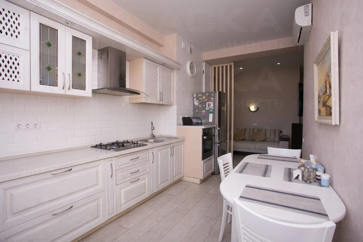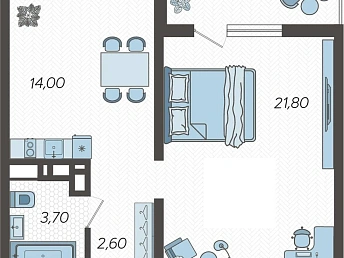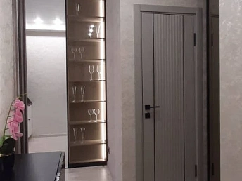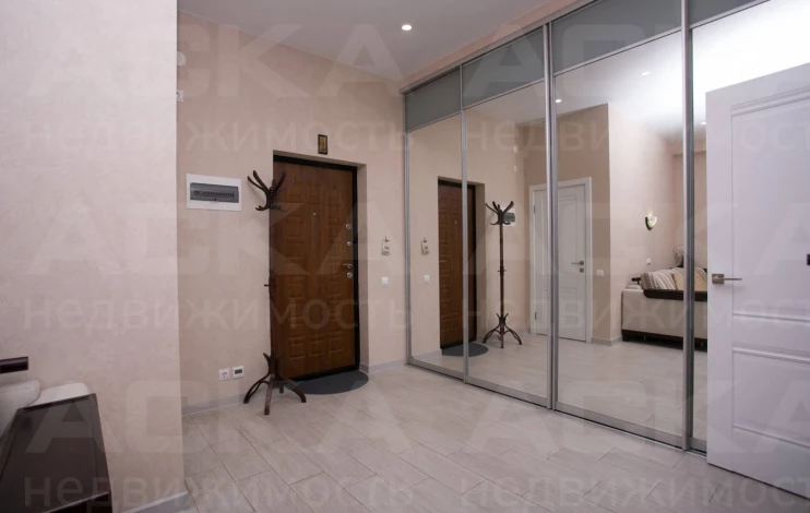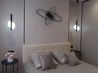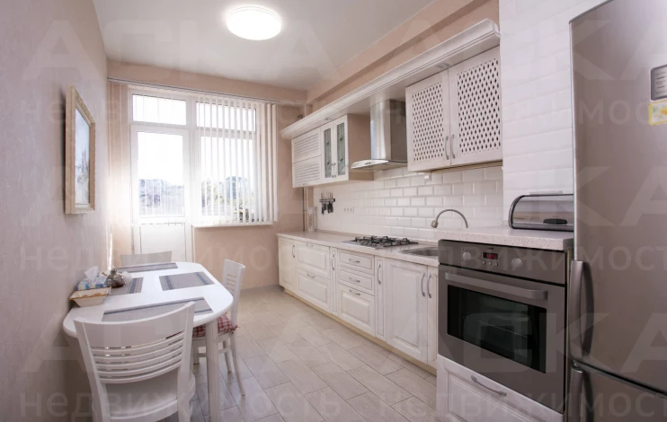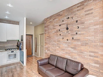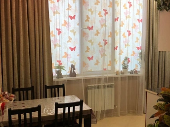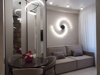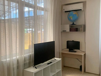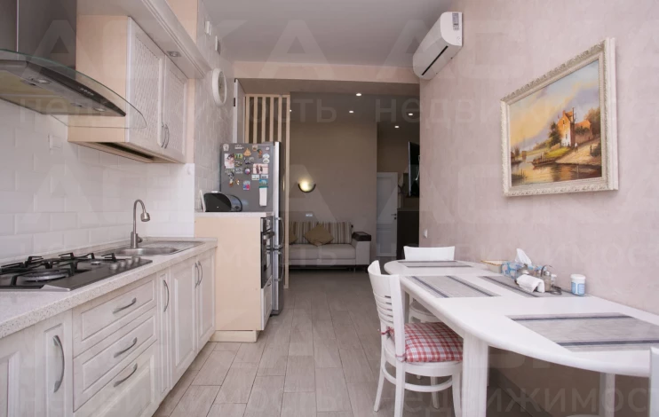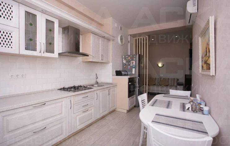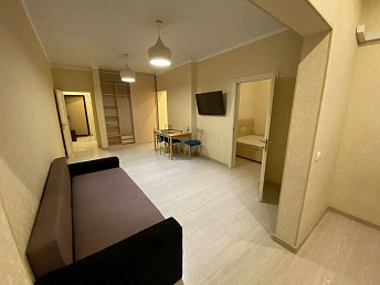 Просторная функциональная кухня с большим бесшумным холодильником, газовой варочной панелью, духовым шкафом. В квартире установлен газовый котел Electrolux на подогрев воды и отопление. В каждой комнате стоит бесшумный инверторный кондиционер. Есть WI-FI, Smart-TV. В гостиной двуспальный диван-кровать, тумба под ТВ, ТВ на поворотном кронштейне, компактно организованные места для хранения вещей.