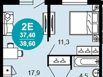 Двухкомнатная квартира S 38.6 м² на 4 эт., р-он Кудепста, Лот № 172957