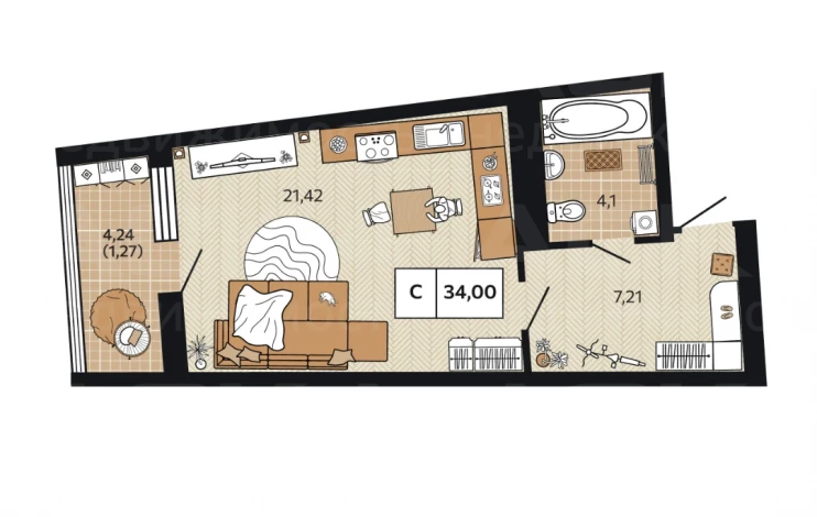 Двухкомнатная квартира S 34 м² на 5 эт., р-он Донская, Лот № 176998