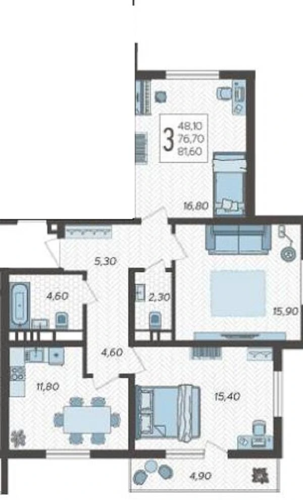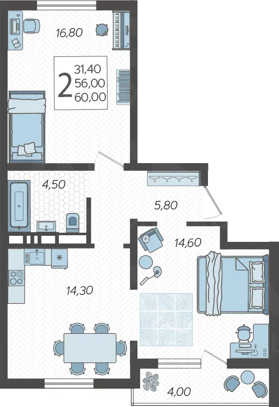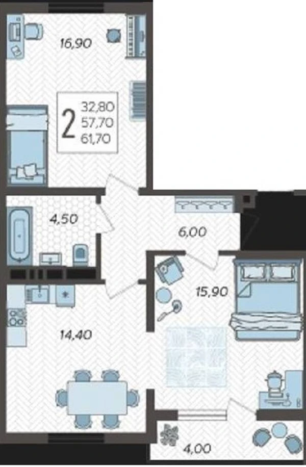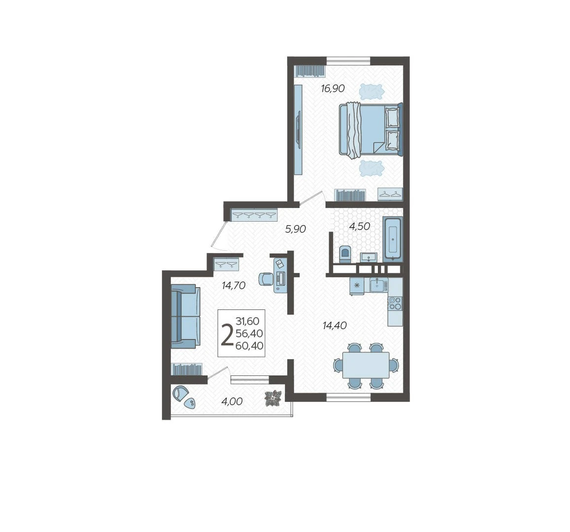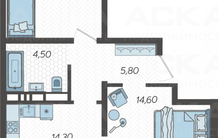Двухкомнатная квартира S 61.2 м² на 3 эт., р-он Раздольное, Лот № 177257