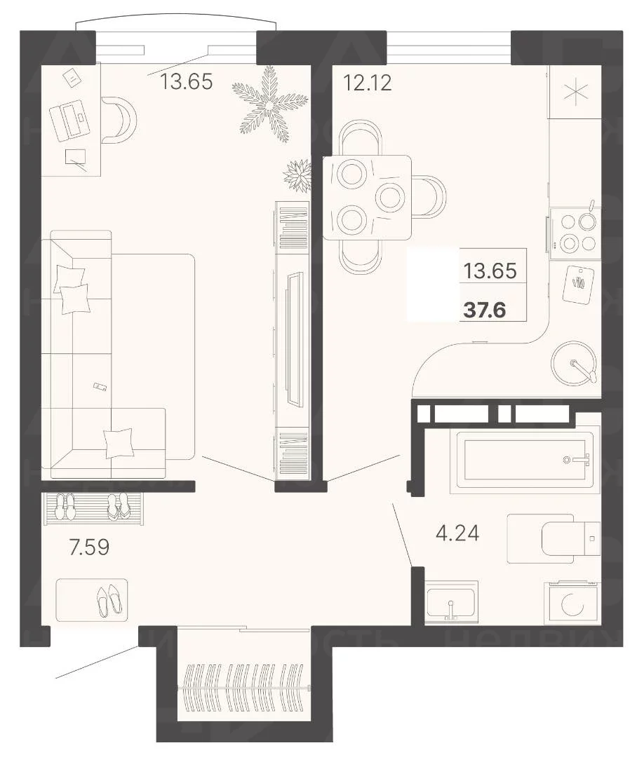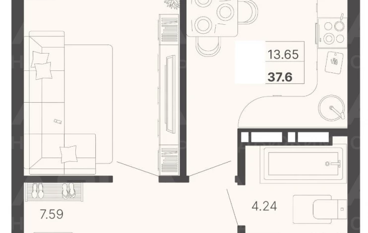 Двухкомнатная квартира S 37.6 м² на 14 эт., р-он КСМ, Лот № 187679