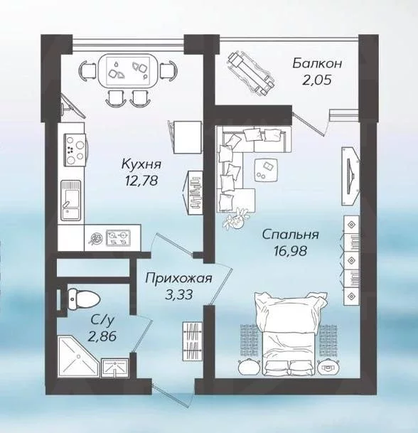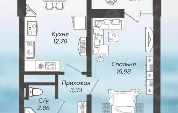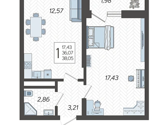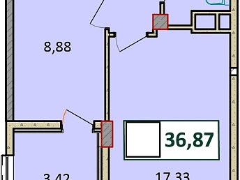 Двухкомнатная квартира S 38.17 м² на 6 эт., р-он Бытха, Лот № 179711