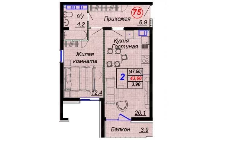 Двухкомнатная квартира S 47.5 м² на 10 эт., р-он Дагомыс, Лот № 181056