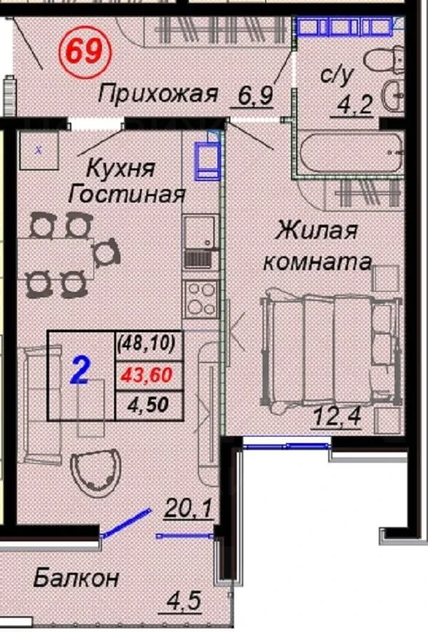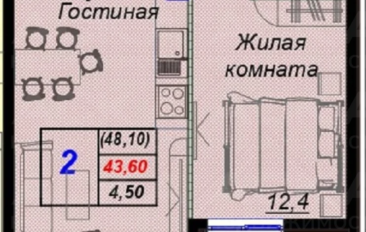 Двухкомнатная квартира S 48.1 м² на 12 эт., р-он Дагомыс, Лот № 172242