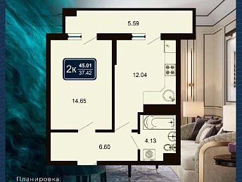 Квартира 1 комн., S 40.9 м² на 4 эт., ремонт Авторский, р-он Мамайка, Лот № 173901