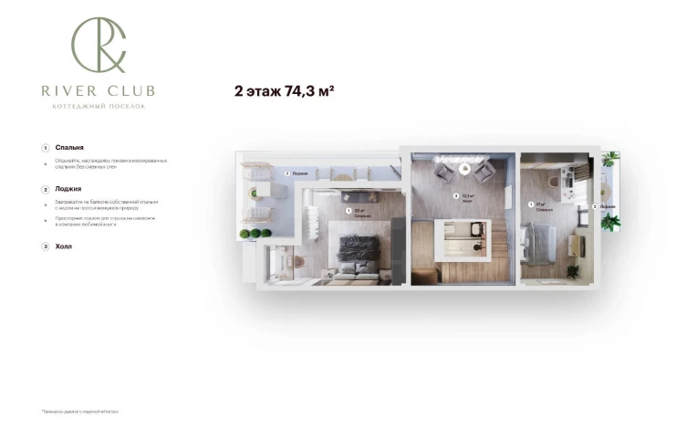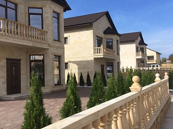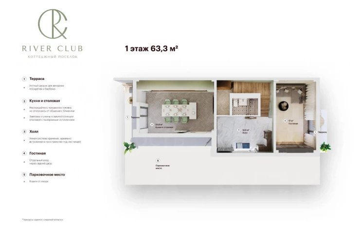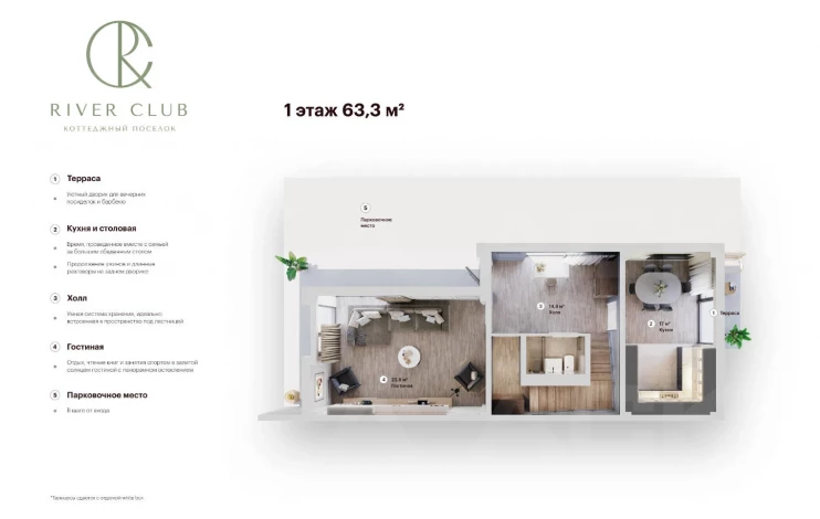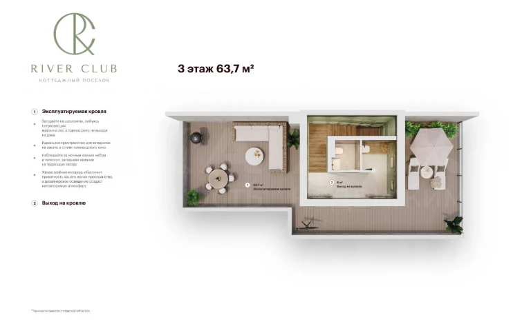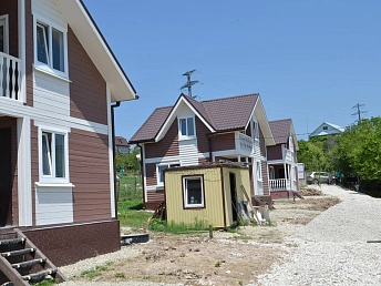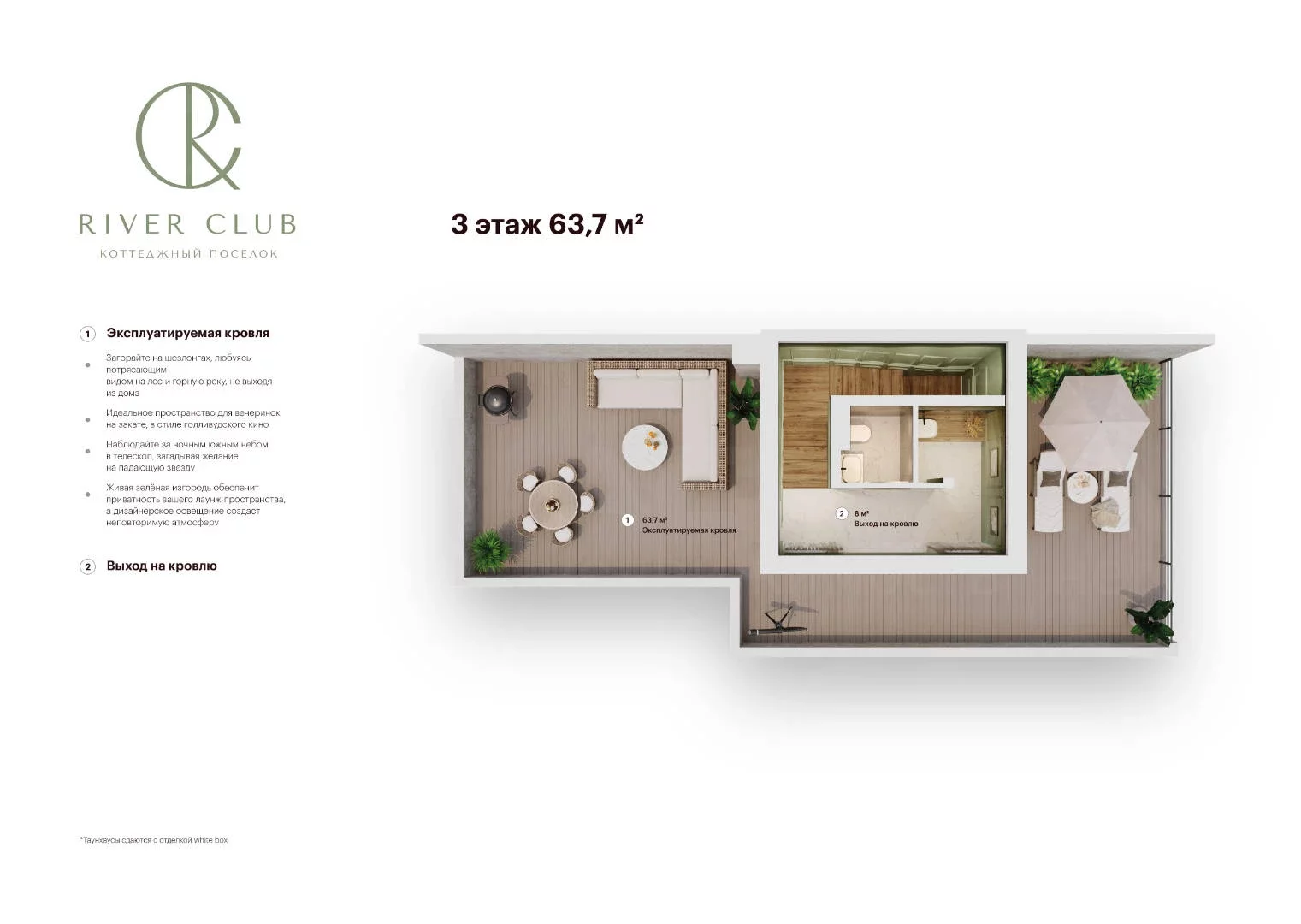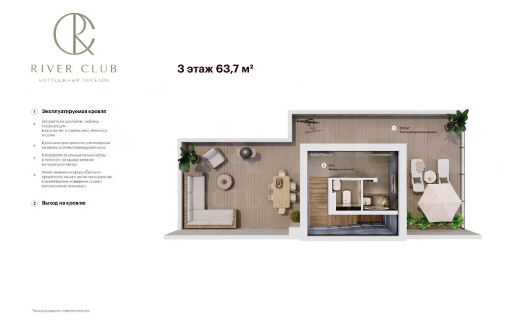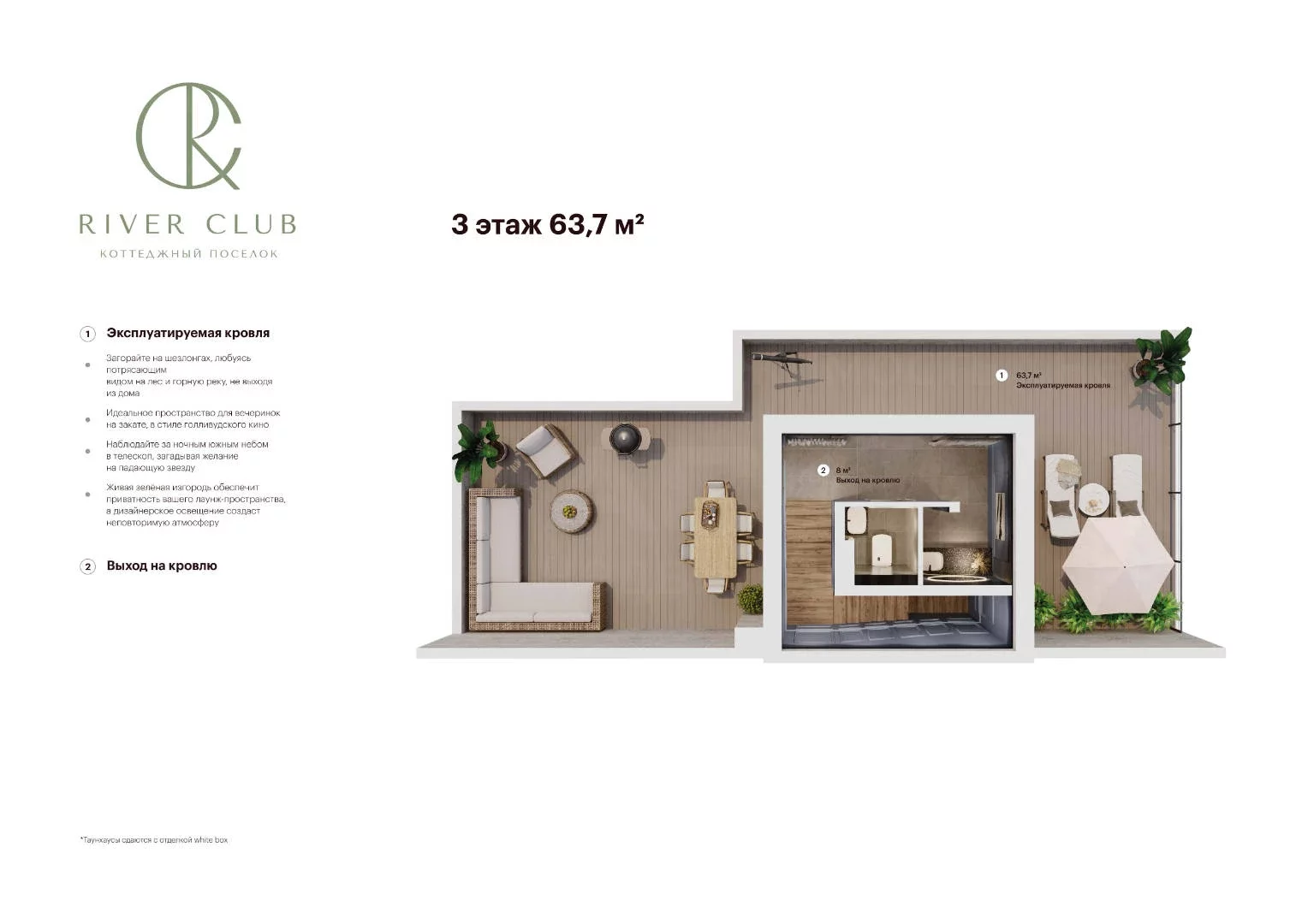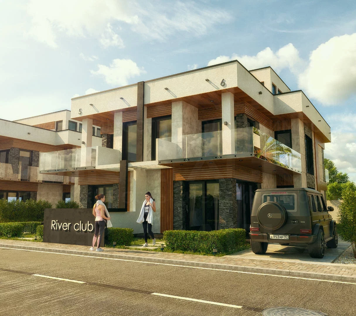 Посёлок благоустроен всем необходимым для приятного отдыха: восемь приватных зон с беседками, продуманный ландшафтный дизайн с зелёными газонами и декоративными растениями, детская и спортивная площадки, корт для большого тенниса, спортивный бассейн 20×10 метров, подогреваемый бассейн 10×5 метров, зона отдыха с шезлонгами, ресторан, спортзал, SPA, баня на дровах со своей заводью, брусчатая набережная 450 метров для прогулок вдоль реки. Посёлок представляет из себя комплекс коттеджей бизнес-класса, разделённых на дуплексы, к каждому из которых полагается 2 индивидуальных парковочных места и теневая приватная терраса. У каждого дома своя эксплуатируемая кровля, которая идеальна для отдыха: здесь можно загорать, встречать рассветы и провожать закаты, наслаждаясь красотой ландшафта, горным воздухом и премиальным комфортом, а также можно разместить джакузи или же барбекю. В отделке вентилируемых фасадов используются премиальные технологичные материалы японской фирмы KMEW, полностью повторяющие фактуру натуральных материалов: дерево, мрамор и камень. Панорамные окна с графитовым напылением обеспечивают обильное естественное освещение, меж тем не перегревают дом солнечными лучами.