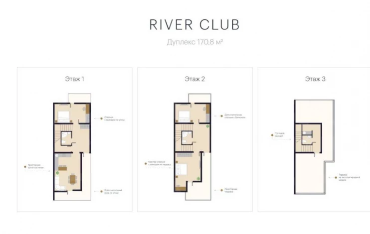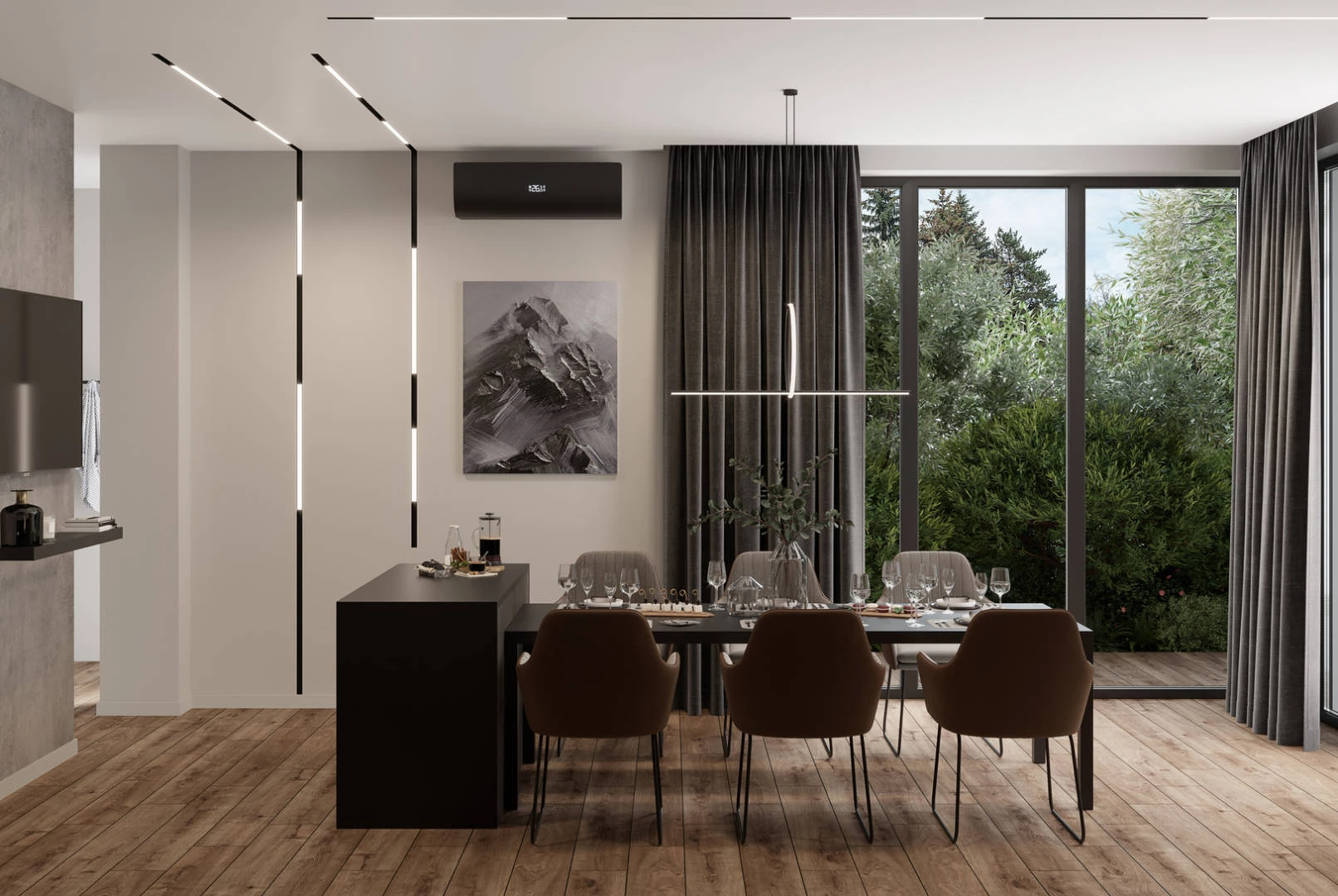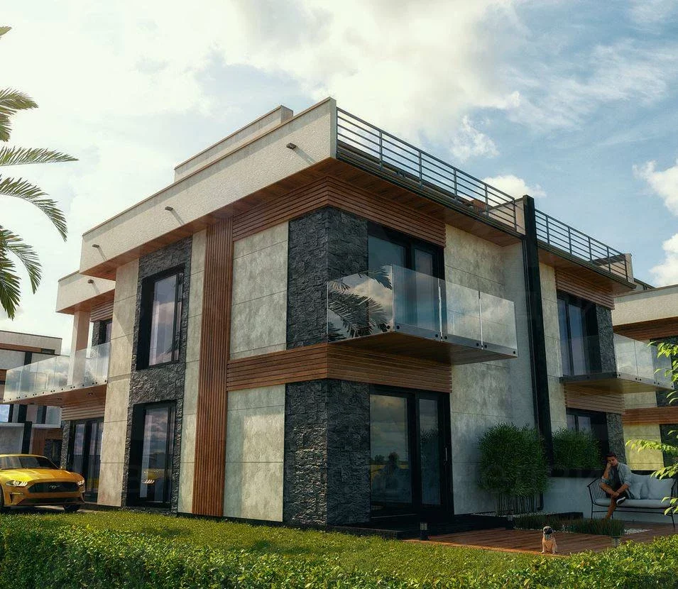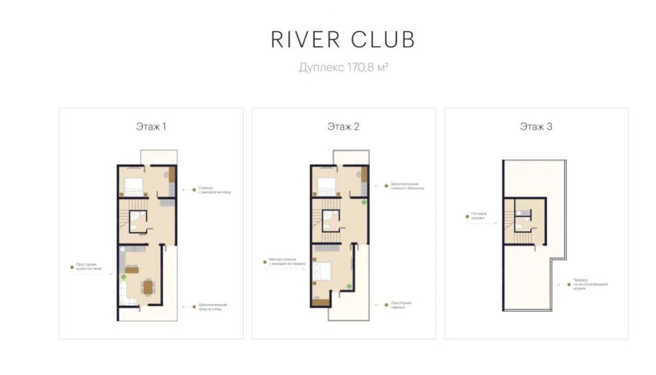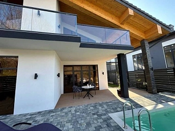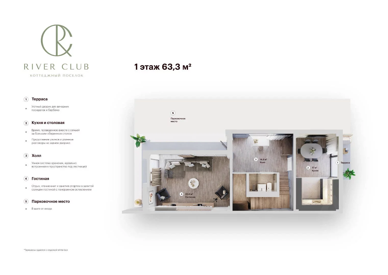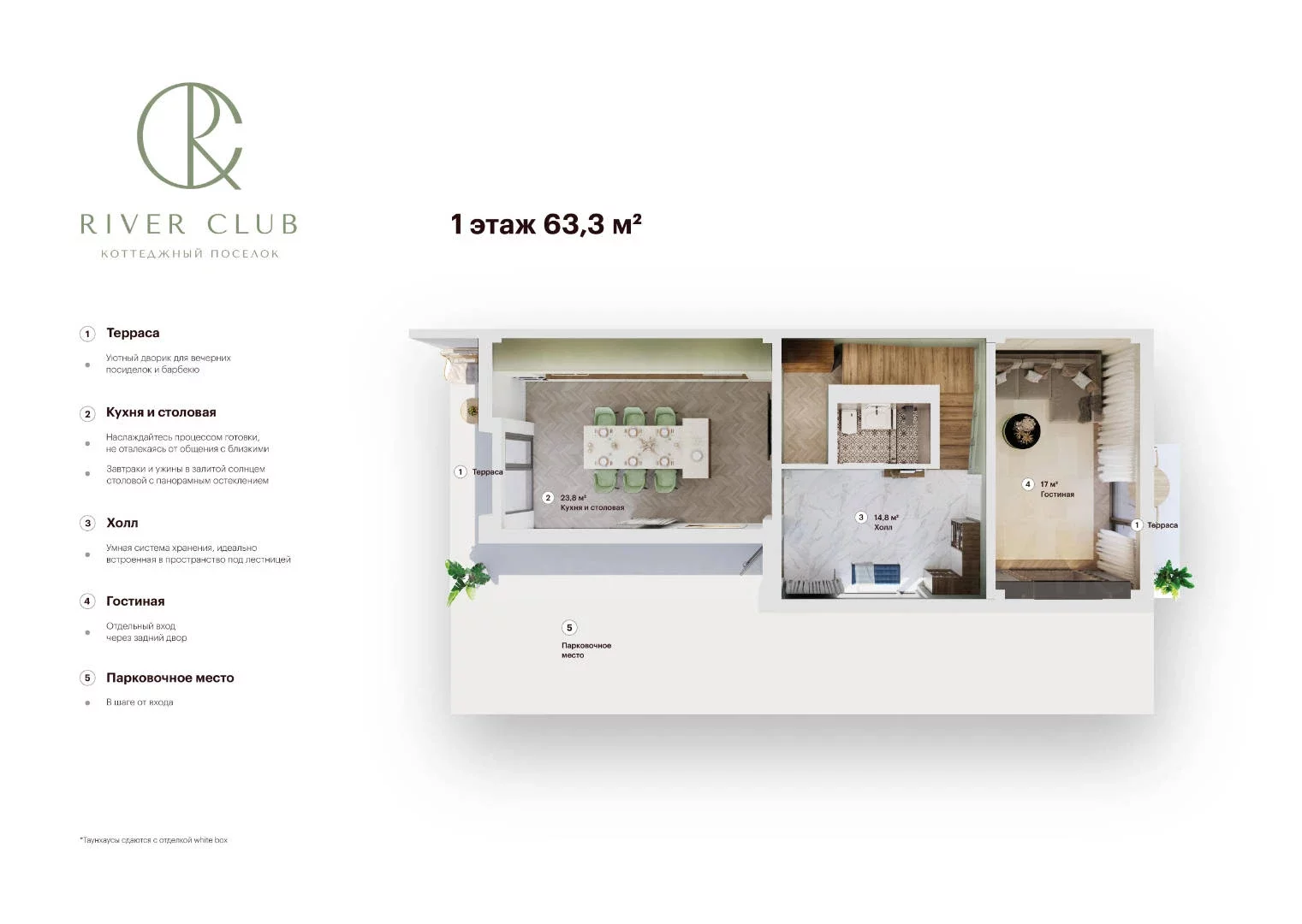 Посёлок благоустроен всем необходимым для приятного отдыха: восемь приватных зон с беседками, продуманный ландшафтный дизайн с зелёными газонами и декоративными растениями, детская и спортивная площадки, корт для большого тенниса, спортивный бассейн 20×10 метров, подогреваемый бассейн 10×5 метров, зона отдыха с шезлонгами, ресторан, спортзал, SPA, баня на дровах со своей заводью, брусчатая набережная 450 метров для прогулок вдоль реки. Посёлок представляет из себя комплекс коттеджей бизнес-класса, разделённых на дуплексы, к каждому из которых полагается 2 индивидуальных парковочных места и теневая приватная терраса. У каждого дома своя эксплуатируемая кровля, которая идеальна для отдыха: здесь можно загорать, встречать рассветы и провожать закаты, наслаждаясь красотой ландшафта, горным воздухом и премиальным комфортом, а также можно разместить джакузи или же барбекю. В отделке вентилируемых фасадов используются премиальные технологичные материалы японской фирмы KMEW, полностью повторяющие фактуру натуральных материалов: дерево, мрамор и камень. Панорамные окна с графитовым напылением обеспечивают обильное естественное освещение, меж тем не перегревают дом солнечными лучами.