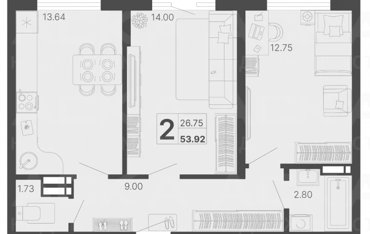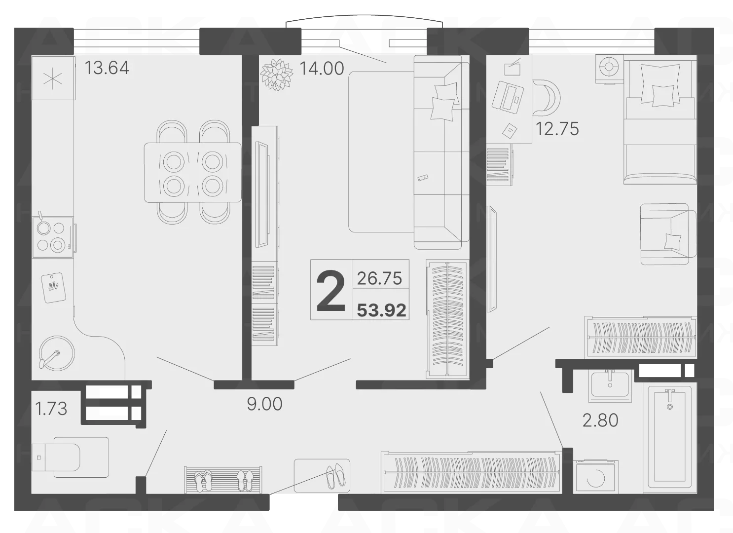 Квартира 2 комн., S 53.29 м² на 2 эт., Лот № 176548