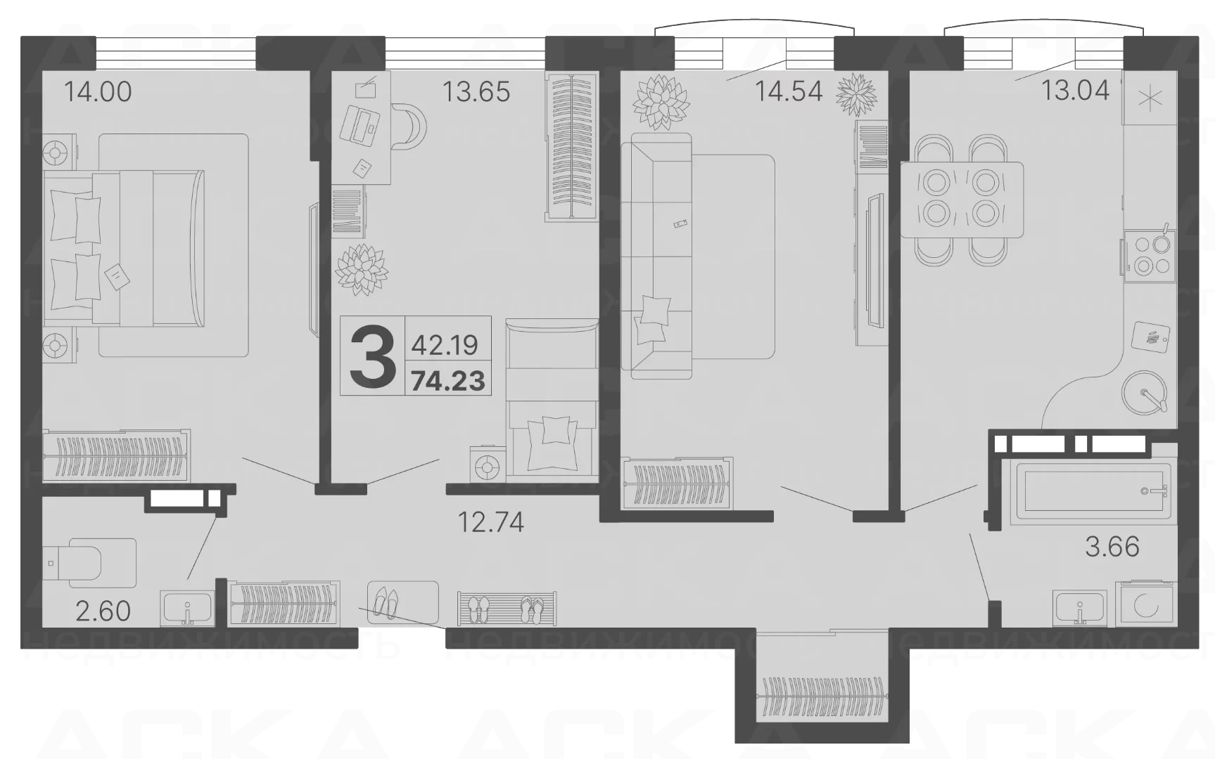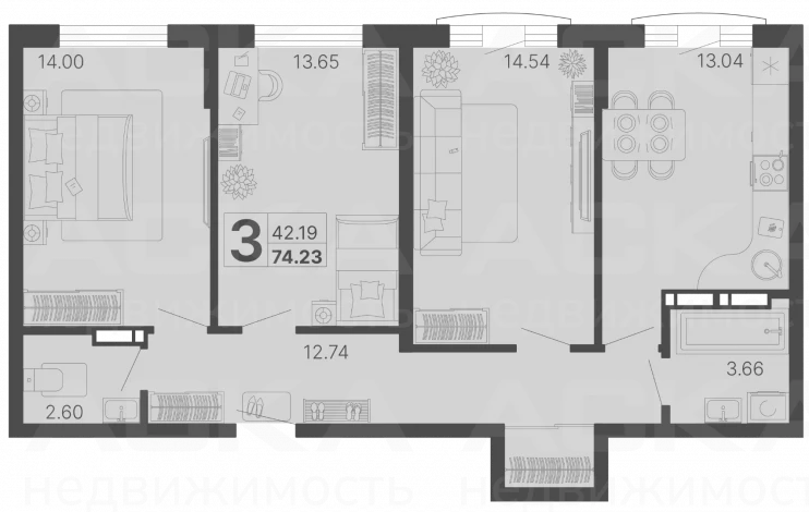 Квартира 3 комн., S 74.23 м² на 2 эт., Лот № 176545