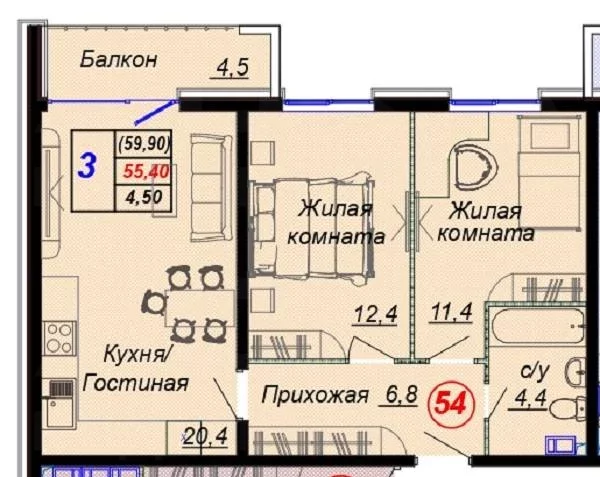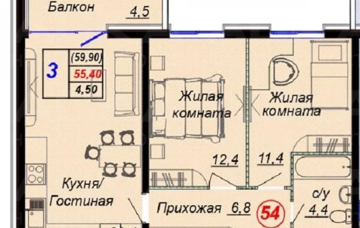 Квартира 3 комн., S 60 м² на 5 эт., Лот № 184464