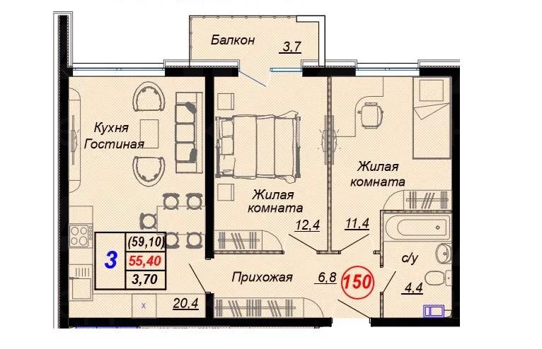 Квартира 3 комн., S 59.1 м² на 6 эт., Лот № 181053