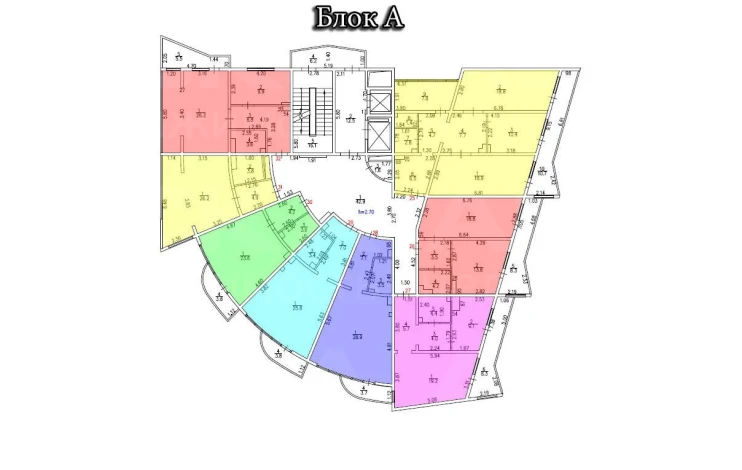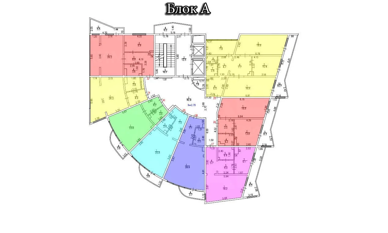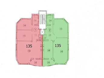 - Минимальная площадь помещений — 31,3 кв. м., максимальная — 98,7 кв. м