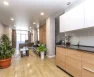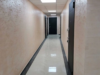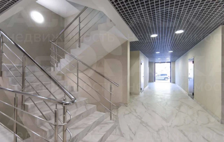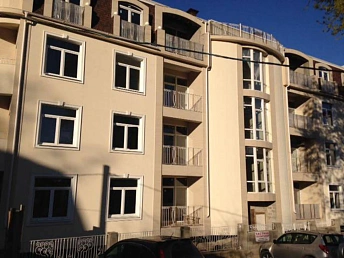 Витражное остекление добавляет фасаду и его строгим и выверенным линиям визуальной легкости. Установлены стеклопакеты с технологиями энергосбережения. Внутренняя отделка мест общего пользования гармонирует с внешней отделкой дома, выполненной в классическом стиле. Пол в подъезде и лестничные марши выложены плитами, имитирующими мрамор, стены декорированы мраморной крошкой.