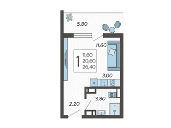 Квартира однокомнатная S 24.5 м² на 1 этаже, Лот № 166669
