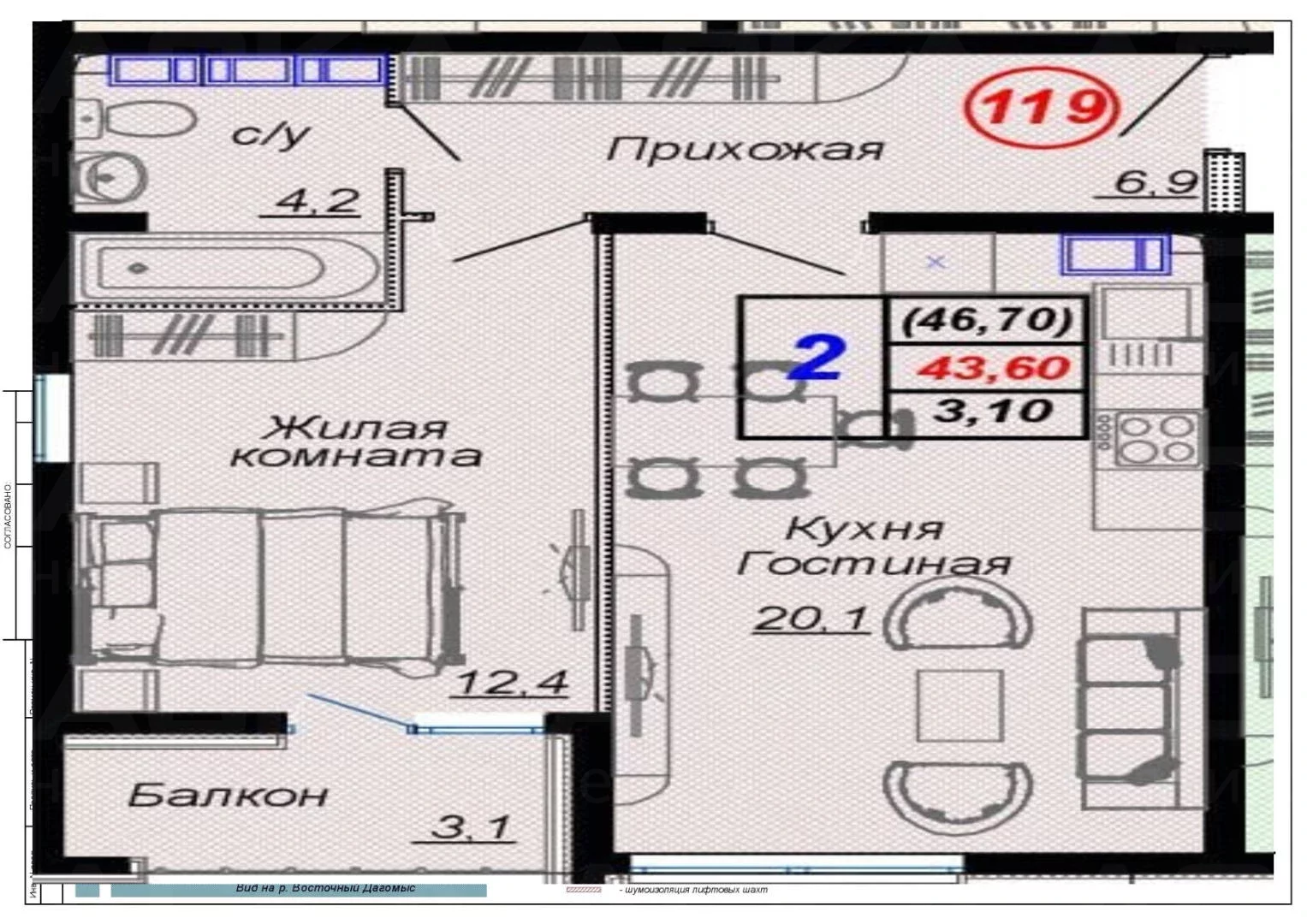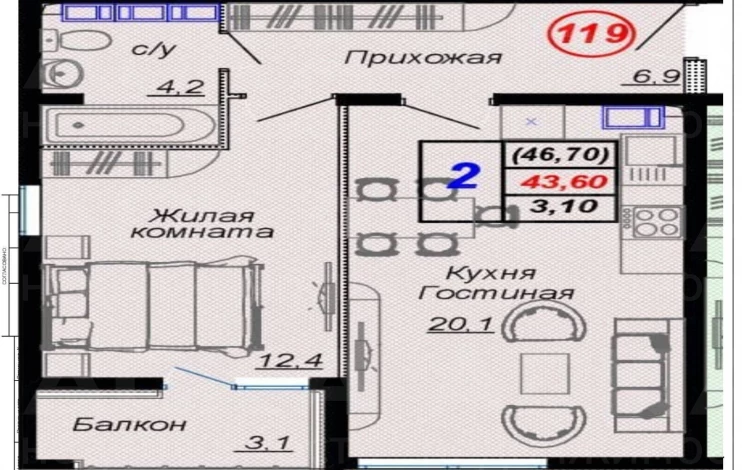 Квартира однокомнатная S 46.7 м² на 11 этаже, Лот № 172601