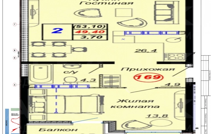 Квартира однокомнатная S 53.1 м² на 16 этаже, Лот № 173048