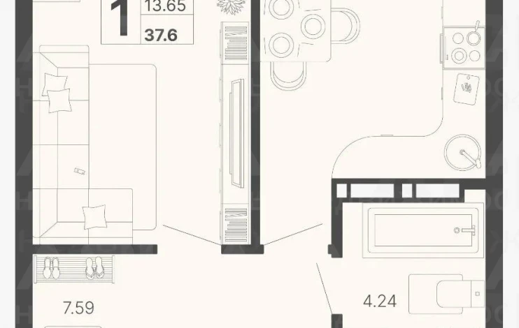 Квартира однокомнатная S 37.6 м² на 3 этаже, Лот № 176611