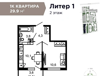 Квартира однокомнатная S 30.1 м² на 3 этаже, Лот № 187005
