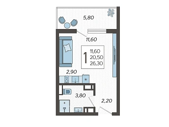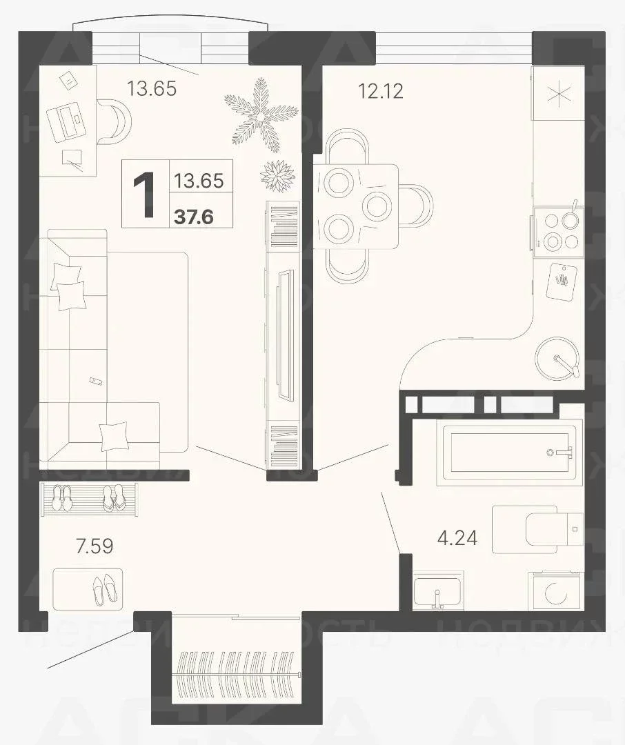 Квартира однокомнатная S 37.6 м² на 5 этаже, Лот № 176615