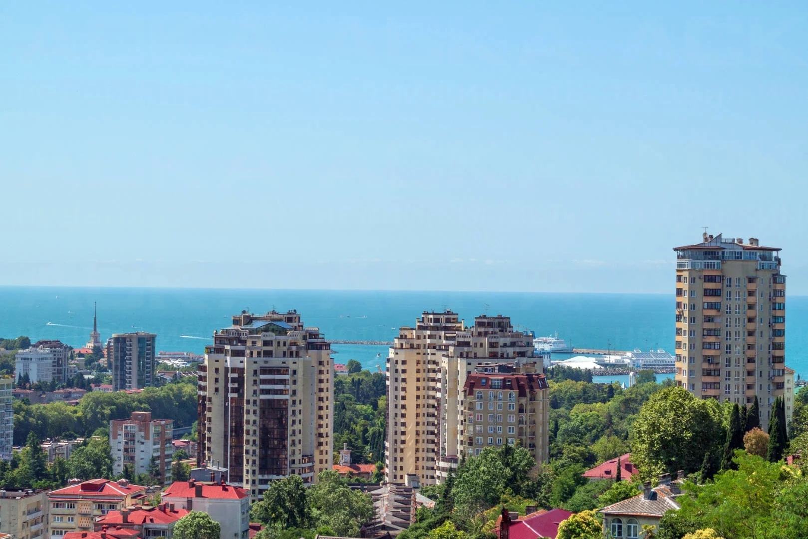 город, море, морской вокзал и горы.