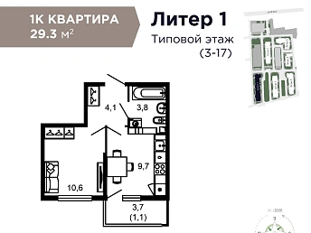 Квартира однокомнатная S 23.8 м² на 10 этаже, Лот № 188428