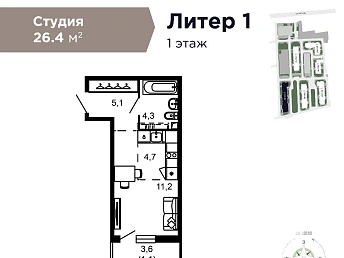 Квартира однокомнатная S 31.9 м² на 11 этаже, Лот № 167875