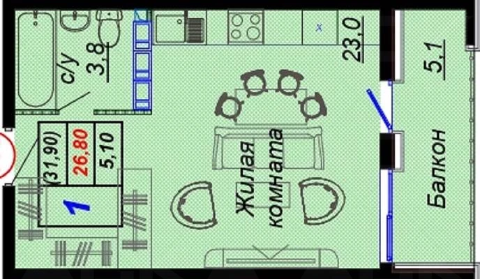 Просторная квартира площадью 31,9 м2 с балконом. Светлая и уютная квартира. Дом с подсветкой. Есть видео, как всё это будет выглядеть.